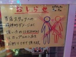 據香港《文匯報》12日報道,圣誕節本應普天同慶,但對單身人士而言,到處都是成雙成對只能覺得郁悶。日本東京八王子市意式餐廳Pia Pia考慮到在平安夜上班員工的感受,特別在門口貼告示,宣布平安夜當日謝絕情侶光顧。 據報道......