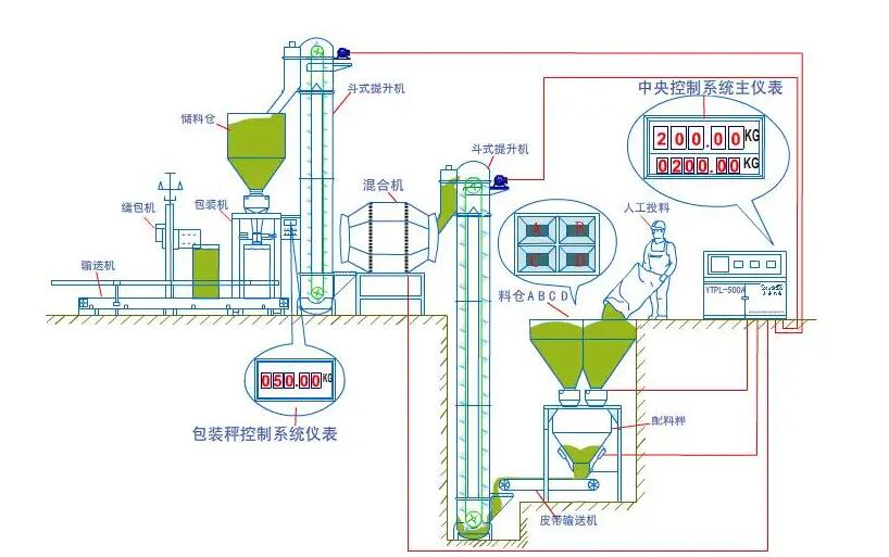 BB肥設備主要由以下設備組成:儲料料倉;給料機;計量秤;攪拌機;大傾角皮帶提升機;定量包裝機;自動縫包機;成品調運皮帶機;電腦控制系統。